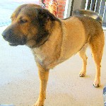 We think he is a German Shepherd/Chow mix--his tongue is about