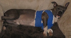 The stitches are out of his face now and the front leg